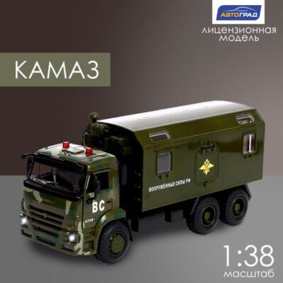 Грузовик металлический «КАМАЗ. Армия», масштаб 1:38, инерция, свет и звук. Металлическая модель грузовика КамАЗ «Автоград» — детально проработанный военный транспорт. Машинка дополнит игрушечный автопарк и станет прекрасным подарком для маленького любителя техники. Особенности модели <ul> <li> Кабина выполнена из металла. Все остальные элементы из пластика.</li> <li> Модель точно детализирована: выштамповка кузова, навесные элементы и др.</li> <li> Встроен инерционный механизм. Он позволяет задать транспорту скорость и дает возможность двигаться самостоятельно, по инерции.</li> <li> Двери кузова, кабины и люк открываются.</li> <li> Масштаб модели — 1:38.</li> <li> Размер: 20 × 7 × 9 см.</li> <li> Световые эффекты: горят фары.</li> <li> Звуковые эффекты: воспроизводит звуки клаксона и сигнализации. </li> <li> Световые и звуковые эффекты срабатывают при открывании дверей. Для работы требуется 3 батарейки типоразмера LR44 (входят в комплект).</li> </ul> Соберите всю коллекцию! Линейка металлических моделей «Автоград» представлена широким ассортиментом транспортных средств: автомобили, автобусы, грузовики, спецтехника и т.д.