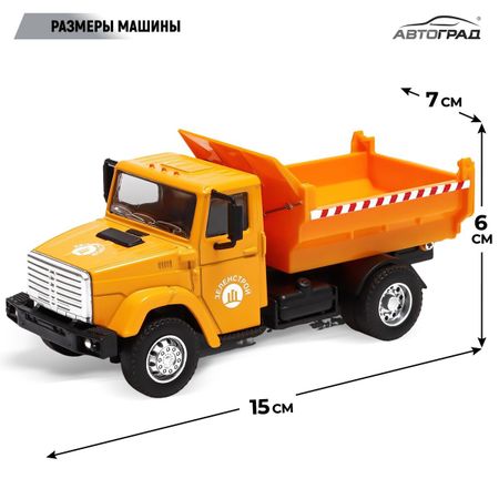 Грузовик металлический «ЗИЛ «Самосвал», инерция, масштаб 1:43, подвижные детали кузова. Металлическая модель грузовика ЗИЛ «Автоград» — детально проработанный спецтранспорт. Машинка дополнит игрушечный автопарк и станет прекрасным подарком для маленького любителя техники. <b> Особенности модели</b> <ul> <li> Кабина выполнена из металла. Все остальные элементы из пластика.</li> <li> Модель точно детализирована: выштамповка кузова, навесные элементы и др.</li> <li> Встроен инерционный механизм. Он позволяет задать транспорту скорость и дает возможность двигаться самостоятельно, по инерции.</li> <li> Кузов поднимается.</li> <li> Масштаб модели — 1:43.</li> <li> Размер: 15 × 6 × 7 см.</li> </ul> <b> Соберите всю коллекцию!</b> Линейка металлических моделей «Автоград» представлена широким ассортиментом транспортных средств: автомобили, автобусы, грузовики, спецтехника и т.д.