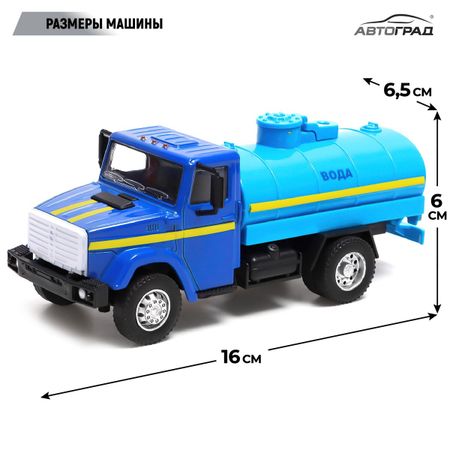 Грузовик металлический «ЗИЛ «Вода», инерция, масштаб 1:43, подвижные детали кузова. Металлическая модель грузовика ЗИЛ «Автоград» — детально проработанный спецтранспорт. Машинка дополнит игрушечный автопарк и станет прекрасным подарком для маленького любителя техники. <b> Особенности модели</b> <ul> <li> Кабина выполнена из металла. Все остальные элементы из пластика.</li> <li> Модель точно детализирована: выштамповка кузова, навесные элементы и др.</li> <li> Встроен инерционный механизм. Он позволяет задать транспорту скорость и дает возможность двигаться самостоятельно, по инерции.</li> <li> Крышка резервуара для воды открывается.</li> <li> Масштаб модели — 1:43.</li> <li> Размер: 16 × 6 × 6,5 см.</li> </ul> <b> Соберите всю коллекцию!</b> Линейка металлических моделей «Автоград» представлена широким ассортиментом транспортных средств: автомобили, автобусы, грузовики, спецтехника и т.д.