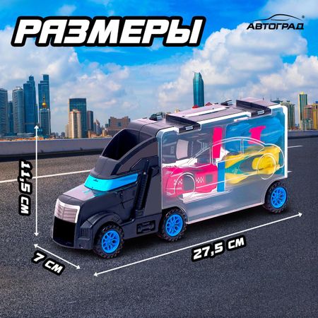 Грузовик «Перевозчик», с машинками 4 шт.. «Перевозчик» готов доставить спорткары для скоростных соревнований в любое время и в любое место. Загрузите машины в кузов автомобиля и начинайте игру. С яркими болидами игровым сюжетам не будет предела. Ребенок устроит настоящие гонки и будет состязаться с друзьями в быстрой и маневренной езде. <b> Особенности набора</b> <ul> <li> Размер перевозчика: 27,5 × 7 × 11,5 см.</li> <li> Размер машинок (без механизма): 7,5 × 3,3 × 2,5 см.</li> <li> Все элементы выполнены из безопасного для детей пластика. Краска не содержит вредных веществ.</li> <li> Для детей старше 3 лет.</li> </ul> <b> Увлекательно и полезно</b> Разнообразная техника доставит малышу радость, будет способствовать развитию пространственного и образного мышления, мелкой моторики, координации движений и эмоционального восприятия. Ни один юный гонщик не останется равнодушным!