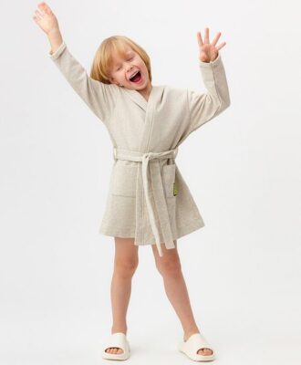 Домашний халат с поясом молочного цвета для мальчика. Мягкая хлопковая ткань меланж с небольшим добавлением эластана приятна на ощупь и способствует оптимальной терморегуляции. Благодаря включению разноцветных волокон в состав оттенок халата выглядит особенно привлекательным. Прямой крой модели и спущенная линия плеча способствуют свободной и комфортной посадке, а при помощи пояса можно отрегулировать необходимую степень прилегания. Петельки на халате предотвратят потерю пояса. На полочке расположены два удобных накладных кармана, на одном из которых стильная деталь — яркий-принт нашивка. Детский халат незаменим после бани или душа, потому что подарит ребенку максимальный комфорт, тепло и ощущение уюта.