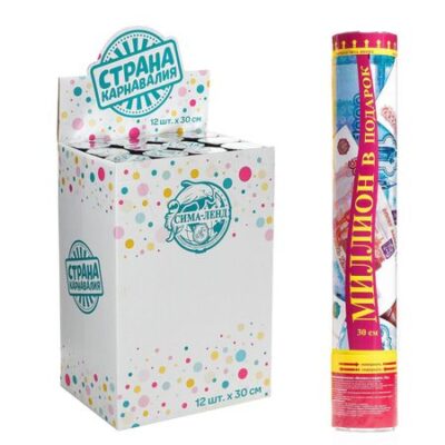 Хлопушка пневматическая «Миллион в подарок», рубли, серпантин, бумага. Как оригинально завершить поздравление, придать подарку по-настоящему взрывной характер? Решение есть: пневмохлопушка к вашим услугам. Она будет стрелять! Но не пугайтесь — серпантином, конфетти и фольгой. Приводится в действие поворотом специально обозначенной части за счет сжатого воздуха. К тому же пневмохлопушка — это вовсе не пиротехника, а значит, вы можете безопасно устраивать свои маленькие праздники где угодно: и в помещении, и на улице! И будьте уверены, с пневмохлопушкой ваши поздравления будут услышаны!