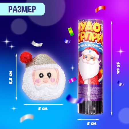 Хлопушка с игрушкой «Чудо-сюрприз», Дед Мороз, новогодняя серия. Хлопушка с игрушкой «Чудо-сюрприз. Дед Мороз» — это идеальный атрибут для создания праздничной атмосферы на вечеринке по случаю Нового года. Изделие размером 5 × 15 см наполнено цветной фольгой. Внутри хлопушки вас ждет замечательная мягкая игрушка размером 5 × 5,5 см. Легкий и безопасный механизм активации позволяет использовать хлопушку в помещении и на улице. <b> Как использовать</b> <ul> <li> Встряхните хлопушку для активации содержимого.</li> <li> Поверните нижнюю часть по направлению стрелок.</li> <li> Направьте хлопушку вверх и наслаждайтесь эффектом, когда яркая фольга разлетается по комнате.</li> </ul> Хлопушка отлично подойдет для Новогодних вечеринок. Она также может стать частью декора или выступить в качестве необычного сюрприза для гостей.
