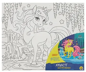 Вашему вниманию предлагается набор для детского творчества «Холст с красками по номерам «Чудесный единорог». В состав набора входит холст 25х30 см с нанесенным контуром, 7 акриловых красок, кисть. Для детей с 3 лет.