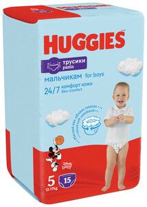 Подгузники трусики Huggies для мальчиковВстречайте нашу новинку – трусики №1* для мальчиков с новыми героями, липучкой-утилизатором и усиленным впитывающим слоем! Теперь ваши любимые трусики-подгузники в новом качестве!Мы создали подгузники-трусики, с использованием новейших азиатских материалов и технологий. В них вашему малышу будет комфортно и свободно, ничто не стеснит движения! Трусики-подгузники Huggies для мальчиков стали еще лучше и надежнее благодаря увеличенному впитывающему слою.Дополнительный сверхмягкий слой на пояске обеспечивает комфортную и эластичную посадку с меньшим давлением на животик, снижая риск появления красных следов на коже ребенка. В течение дня поясок подгузников-трусиков Huggies адаптируется к меняющимся размерам животика, нежно обнимая его.Наши трусики Хаггис не содержат отдушек, хлора и латекса для лучшей заботы о коже вашего активного мальчика и о природе!Специальный впитывающий слой DryTouch расположен с учетом анатомических особенностей мальчиков (смещен вперед), впитывая влагу за секунды и сохраняя кожу сухой днем и ночью.Обновленные трусики-подгузники Huggies с мягким, как облачко, пояском и усиленным впитывающим слоем— нежная забота и надежная защита для максимального комфорта активных мальчиков.Окутайте малыша мягкостью облака! Усиленный впитывающий слой мгновенно впитывает и распределяет влагу, не образуя комок между ножек Мягкие эластичные резиночки вокруг ножек обеспечивают дополнительную защиту от протекания Легко надеть — просто натяните трусики, легко снять — разорвите боковой шов Липучка-утилизатор закроет запах на замок! Индикатор влаги подскажет, когда придет время сменить трусики 2 замечательных новых дизайна в одной упаковке!Мы рекомендуем менять подгузник каждые 3 часа для лучшей заботы о Вашем малыше.