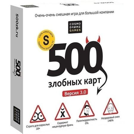 Зажигательная игра «500 злобных карт 3.0» — в новой версии еще больше беззаботного веселья и пикантного юмора! Самые острые приколы, популярные сетевые мемы, искрометная ирония и шуточки ниже пояса любовно размещены авторами на 100 новых карточках вопросов и 400 карточках ответов. Внимание! Храните игру в недоступном для детей, родителей и слишком серьезных людей месте!Эта яркая игра создана для шумных дружеских посиделок. Чем больше игроков в компании, тем веселее. Правила так просты, что на все объяснения уйдет не больше пары минут, а дальше смех и ничего кроме смеха, так что берегите ваши животы!Вас порадует эта игра, если:• вас не смущают шуточки 18+;• у ваших друзей тоже все отлично с чувством юмора;• вы планируете вечеринку в большой компании и хотите убойно повеселиться;• вы ищете презент для приятеля без лишних комплексов;• иногда вам хочется просто расслабиться и посмеяться.Третий выпуск можно использовать как дополнение к предыдущим или играть отдельно. В комплекте есть все необходимое: карточки, жетоны, поле для получения плюшек, правила.