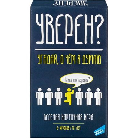 Вечер наступает, и вы семьей или друзьями собрались в уютном домашнем кругу. Что может быть лучше, чем настольная игра, чтобы сблизиться, развлечься и насладиться прекрасным общением? Именно для таких встреч предназначена наша уникальная настольная игра Dream Makers «Уверен?». Будь то домашний ужин, вечеринка и даже пикник на природе, эта игра станет отличным спутником для любого праздника или весёлым развлечением в дороге.Настольная карточная игра «Уверен?» — весёлый способ проверить, умеете ли вы читать мысли окружающих! Цель игры: угадать, какой ответ на забавные вопросы дали ваши друзья. Более 200 очень разных вопросов для игроков не оставят равнодушным никого и заставят посмеяться и даже задуматься. Игра предлагает 2 режима игры, это позволяет играть в неё бесконечно! В коробке уже есть всё, что нужно для игры: карточки, блокнот, карандаши для записи.Комплектация: игровые карточки: 108 шт.; блокнот для записи: 1 шт.; карандаши: 4 шт; правила игры: 1 шт.