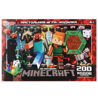 Игра настольная Умные игры 4660254450981. Настольная игра-ходилка в треугольной коробке «По мотивам MINECRAFT» ТМ «Умные игры» — увлекательная игра, в которой можно стать героем виртуальной Вселенной!<br> <br> Особенности:<br> — красочный дизайн в тематике популярной компьютерной игры<br> — увеличенное количество ходов (200)<br> — понятные правила игры<br> — количество игроков: 2-4<br> <br> Комплектация:<br> — картонное игровое поле размером 42 х 58 см<br> — игральный кубик<br> — 4 разноцветные пластиковые фишки<br> — правила<br> <br> Проведите время с семьей или друзьями вместе с любимыми героями. Игра развивает воображение, навыки общения и логическое мышление. Окунитесь в мир приключений!<br> <br> В игре могут принимать участие от 2 до 4 человек. Игроки выбирают себе фишки и ставят их на старт. Очередность хода определяется любым удобным способом. В свой ход по броску кубика игроки перемещаются по дорожке на выпавшее количество ходов. Число на кубике также соответствует дополнительному эффекту, который игроку сообщает рулетка в центре поля. Ее зеленые ячейки дают игроку эффекты поверхности, а оранжевые — эффекты подземелья. Если в определенной ячейке рулетки стоит красный круг с белым крестиком, игрок не получает никаких дополнительных эффектов. <br> <br> Все игроки начинают игру на поверхности и получают бонусы от эффектов поверхности. Например, если на кубике в начале хода выпало 3, игрок делает 3 шага вперед, а затем применяет эффект поверхности и также проходит вперед по ближайшей зеленой стрелке.<br> <br> Если фишка остановилась на ячейке с изображением подземелья, игрок попадает на подземный уровень. Далее он получает эффекты подземелья на каждом ходу. Например, если на кубике в начале хода выпало 1, игрок делает 1 шаг вперед, а затем пропускает ход. Специальные ячейки помогут вернуться на поверхность и, начиная с этого хода, игрок снова будет получать эффекты поверхности и так далее.<br> <br> Побеждает игрок, который первым доберется до финиша на двухсотой ячейке дорожки.<br> <br> Игра-ходилка ТМ «Умные игры» развивает:<br> — ориентацию на плоскости<br> — внимание<br> — визуальное восприятие<br> — логику<br> — социально-коммуникативные навыки<br> <br> Размер упаковки: 217 х 330 х 27 мм. Материал: пластмасса + картон.<br> Рекомендовано детям от 6-ти лет.