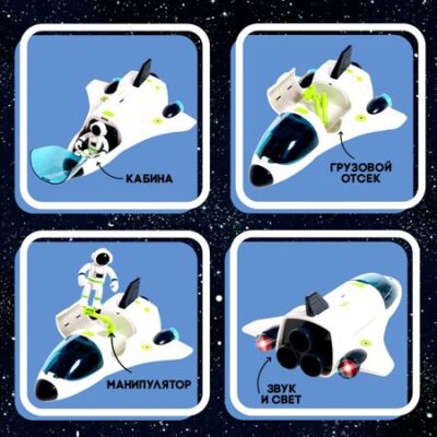 Игровой набор «Исследование космоса», шаттл. Игровой набор «Исследование космоса» создан специально для любителей техники и исследователей межпланетных пространств! Ведь в него входит все необходимое для галактического приключения: шаттл и отважный космонавт. Бонус! В комплекте вы найдете обучающие карточки с интересными фактами и заданиями. <b> Космический шаттл и космонавты</b> <ul> <li> Шаттл еще называют звездолетом или космическим кораблем, он отправит астронавта на секретное задание.</li> <li> В шаттле предусмотрено 2 отсека. Один для пилота, второй оснащен механическим краном — к нему можно прикрепить астронавта для выхода в открытый космос.</li> <li> Имеет световые и звуковые эффекты: воспроизводит звук полета, светятся лампочки. Для работы необходимо 2 батарейки типоразмера AAА (в комплекте).</li> <li> В шаттл можно усадить фигурку космонавта.</li> <li> У фигурки подвижные руки, ноги и голова.</li> </ul>
