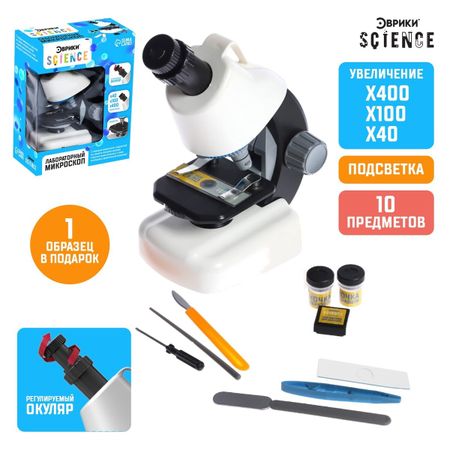 Игровой набор «Лабораторный микроскоп», с цветными фильтрами и подсветкой, увеличение x40, x100, x400. Игровой набор «Лабораторный микроскоп» позволит малышу научиться пользоваться микроскопом, попробовать себя в роли ученого и исследовать мир вокруг! Начните с готового образца микропрепарата и продолжите любыми интересующими вас предметами: от ниток до кристаллов. <b> Как работать с микроскопом</b> <ul> <li> С помощью откройте крышку блока для батареек. Вставьте 2 батарейки типаразмера AA, соблюдая полярность. Закройте крышку блока доя батареек и затяните шурупы.</li> <li> Включите блок питания на панели микроскопа.</li> <li> Поместите слайд с образцом на предметный столик, закрепите его с помощью зажимов и включите подсветку. Объект должен располагаться прямо над подсветкой.</li> <li> Поверните револьверную головку объектива, чтобы выбрать необходимое увеличение.</li> <li> Чтобы изображение стало четким, поверните регулятор фокусировки.</li> </ul> <b> Особенности микроскопа</b> <ul> <li> Микроскоп оборудован регулируемым окуляром, который можно вращать на 360 градусов.</li> <li> Качественный окуляр позволяет увеличивать объекты в 40, 100 и даже 400 раз.</li> <li> Для того, чтобы поменять линзу, необходимо просто прокрутить ее.</li> <li> Подсветка обеспечивает хорошее качество изображения, а специальное колесико фокусировки настраивает необходимую резкость.</li> <li> За поднятие и опускание микроскопа отвечают два серых колеса.</li> <li> Размеры микроскопа: 21,8 × 10 × 16,3 см.</li> <li> Для работы необходимы 2 батарейки типаразмера АА. Батарейки в набор не входят.</li> </ul> <b> Увлекательно и полезно!</b> Игра с микроскопом расширяет кругозор ребенка, стимулирует любознательность, развивает внимательность и прививает тягу к знаниям. Рекомендовано детям старше 3 лет.