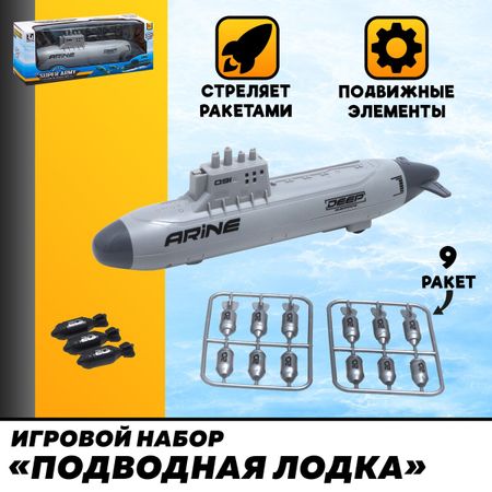 Игровой набор «Подводная лодка», стреляет ракетами, подвижные элементы, цвет светло-серый. Подводная лодка с функцией запуска ракет станет отличным выбором для юных исследователей морских глубин и поклонников военной техники. Игровой набор сочетает в себе увлекательные элементы игры и возможность развивать важные навыки. <strong> Особенности</strong> <ul> <li> Имитация боевой подводной лодки с функцией запуска ракет (9 ракет в комплекте).</li> <li> Наличие подвижных элементов для реалистичного управления.</li> <li> Рекомендовано для детей от 3 лет.</li> <li> Изготовлен из безопасного пластика.</li> </ul> С этим набором ребенок сможет создавать захватывающие сценарии морских приключений. Запуск ракет превращает обычную игру в динамичное действо, а движущиеся части модели делают ее более интерактивной. Игра с подводной лодкой способствует развитию внимания к деталям, координации движений и творческого мышления.
