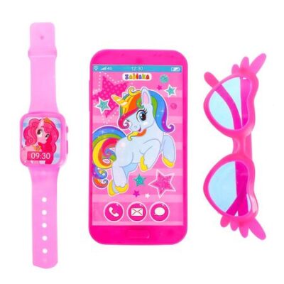 Игровой набор «Волшебный мир пони»: детский телефон, очки, часы, русская озвучка, цвет розовый. Набор из музыкального телефона, часов и очков — это тройное удовольствие от игры. Яркие картинки на предметах привлекут внимание ребенка, а звуковые эффекты в смартфоне станут основной для увлекательных игр. <b> Звуки и фразы, которые воспроизводит телефон:</b> <ul> <li> смех;</li> <li> звонок;</li> <li> мелодию;</li> <li> «Алло, алло! Привет, как дела?»;</li> <li> «Давай дружить»;</li> <li> «Позвони маме»;</li> <li> «Позвони папе».</li> </ul>