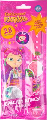 Браслет из мягкого полимера с набором разноцветных элементов различной формы. Цветные элементы крепятся на браслет. Можно собрать разноцветный браслет или узор в стилистике Алисы из мультфильма Сказочный патруль. В комплекте 28 элементовЦветные элементы крепятся на браслет и образуют узор, рисунок, надпись. Элементы можно комбинировать в любом произвольном порядке.