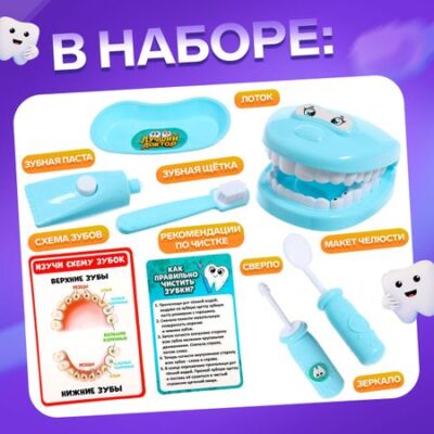 Игровой набор доктора «Лучший доктор. Стоматолог», в пакете. С набором медицинских инструментов у малыша будет все необходимое, чтобы вылечить зубки куклам и плюшевым зверям. Ребенок с удовольствием будет проводить осмотр, устанавливать пломбы и делать уколы — совсем как настоящий стоматолог! Так кроха освоит социальные роли, получит новые знания о важных профессиях, станет внимательнее и заботливее. Игра в доктора не только пробудит фантазию юного специалиста, но и поспособствует развитию эмоционального восприятия, мелкой моторики и воображения. <b> Состав набора:</b> <ul> <li> зеркало;</li> <li> зонд;</li> <li> кюрет;</li> <li> шприц;</li> <li> щипцы;</li> <li> лоток для инструментов;</li> <li> челюсть;</li> <li> схема зубов;</li> <li> рекомендации по чистке.</li> </ul>