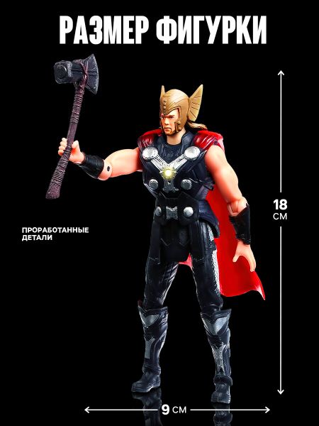 Игрушка, фигурка «Мстители. Тор». Почувствуйте мощь громовержца с детализированной фигуркой Тора! Этот легендарный герой из вселенной Marvel готов к сражениям с врагами, и теперь он может стать частью вашей коллекции. <strong> Особенности набора</strong> <ul> <li> Высокая детализация – фигурка точно повторяет внешний вид персонажа, включая знаменитые доспехи и красный плащ.</li> <li> Подвижные конечности – руки и ноги сгибаются, позволяя разыгрывать эпичные сцены.</li> <li> Световые эффекты – при нажатии на кнопку на груди загорается индикатор.</li> <li> Молот Мьельнир в комплекте – главный атрибут бога грома для битвы с врагами.</li> <li> Сменная голова – создавайте разные образы Тора, меняя выражение лица.</li> <li> Компактные размеры – 18 × 9 см, удобно для игры и коллекционирования.</li> </ul> Этот набор – отличный подарок для поклонников комиксов Marvel и детей, мечтающих о героических приключениях!