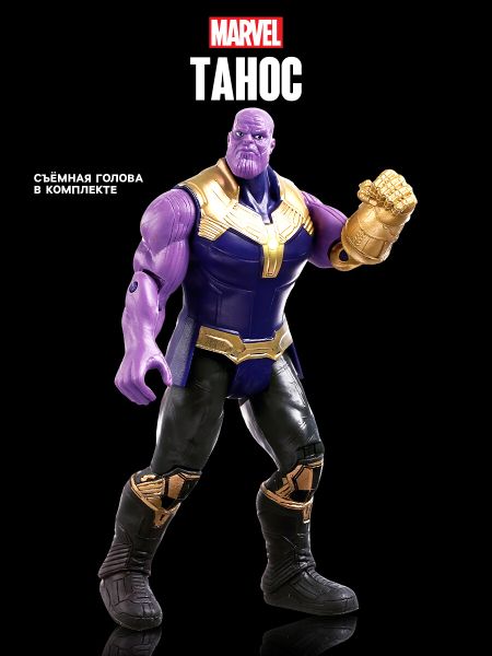 Игрушка, фигурка «Мстители. Танос». Погрузитесь в космическую мощь с Таносом из команды Мстителей! Этот игровой набор позволяет почувствовать всю силу одного из самых могущественных злодеев вселенной Marvel. Фигурка Таноса выполнена с высокой детализацией, а аксессуары и подвижные конечности делают ее идеальной для создания захватывающих игровых сцен. Его знаменитая Перчатка Бесконечности готова развернуть невероятные битвы! Особенности <ul> <li> Подходит для детей от 3 лет.</li> <li> Высокая детализация: костюм Таноса и Перчатка Бесконечности выполнены с учетом мельчайших деталей.</li> <li> Съемная голова: меняйте выражение лица Таноса для реалистичной игры.</li> <li> Подвижные конечности: обеспечивают динамичность и позволяют разыгрывать эпические битвы.</li> <li> Аксессуар: двусторонний меч Таноса для еще большего эффекта.</li> <li> Световой индикатор: активация кнопкой на спине добавляет реалистичности и зрелищности.</li> </ul> Игра и польза <ul> <li> Развитие воображения: дети могут разыгрывать культовые сцены из фильмов Marvel или создавать собственные истории.</li> <li> Интерес к коллекционированию: фигурка станет ключевым элементом любой коллекции супергероев и злодеев.</li> <li> Увлекательные приключения: игровой процесс увлекает и вдохновляет.</li> </ul> С этим игровым набором ваш ребенок сможет воссоздать величие Таноса и окунуться в мир захватывающих приключений Marvel!