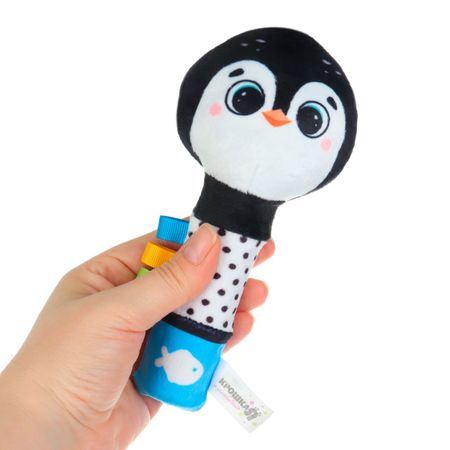 Игрушка — пищалка Крошка Я «Пингвиненок» с погремушкой. Игрушка- пищалка с первых месяцев жизни малыша станет прекрасной развивающей игрушкой вашего ребенка. Игрушку пищалку удобно держать маленькими пальчиками, что развивает мелкую моторику рук. Яркий и приятный образ поможет развить сенсорное восприятие цвета, формы и фактуры. Мягкий звук при сдавливании пищалки активизирует слуховые анализаторы и способствует концентрации внимания. • Игрушка пищит • Яркая, приятная на ощупь ткань • Милые современные образы • Изготовлено из гипоаллергенных материалов. • В упаковке — 1 игрушка