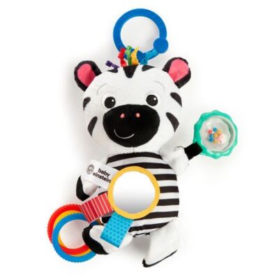 Плюшевая игрушка Зебра помогает малышу познавать мир с помощью самых первых инструментов — своих ощущений! Эта подвесная игрушка стимулирует органы чувств и способствует когнитивному развитию благодаря черно-белому и высококонтрастному дизайну, звукам хруста, разнообразным текстурам, погремушке и многому другому.Малыш с удовольствием изучать свое изображение в зеркале, трогать сморщенный животик Зебры, исследовать шуршащую спину игрушки, играть с разноцветными кольцами и выполнять другие действия. У подвески Зебры есть 3 текстурных кольца, зеркальце в животике, погремушка, шуршащая спинка, а так же 2 сатиновые петельки. Удобное кольцо-держатель, которое позволяет прикрепить игрушку к любой кроватке, переноске, детской коляске.
