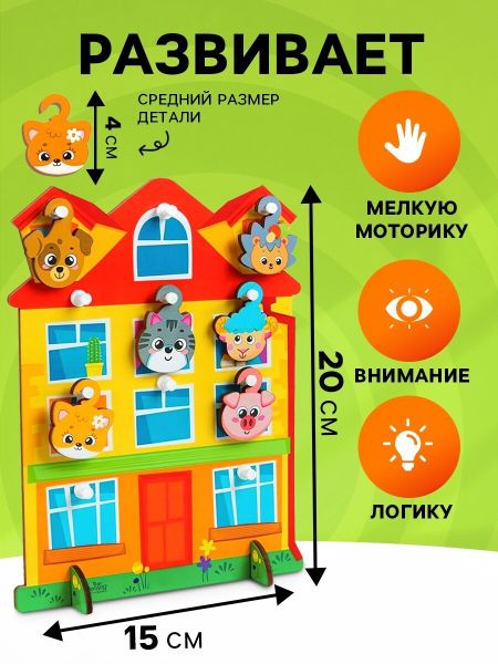 Игрушка с крючками «Дом». Игрушки с крючками — отличный вариант классической игрушки для развития моторики. Суть игры: разместить фигурки на крючках на игровом поле. Занятия с крючками отлично развивают мелкую моторику и координацию движений. Фигурки можно использовать в качестве счетного материала.