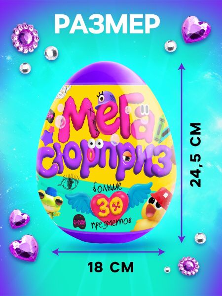 Игрушка — сюрприз в яйце «Мега-сюрприз», больше 30 предметов, фиолетовый. <em> Откройте сокровищницу творчества и стиля!</em> Яйцо-сюрприз «Мега-сюрприз» — мир аксессуаров, украшений и забавных вещиц для маленькой модницы. Внутри ждет больше 30 предметов, которые превратят обычный день в настоящий праздник красоты и воображения. <b> Особенности</b> <ul> <li> Яркий ободок с милым единорогом станет изюминкой любого образа. Пушистая косметичка и мешочек для хранения с тематическим принтом помогут организовать все важные мелочи.</li> <li> Набор из 4 кистей для макияжа с блестками открывает безграничные возможности для экспериментов.</li> <li> Органайзер с бусинами предлагает погрузиться в увлекательное творчество. С помощью наклеек, страз и переводных тату можно создавать яркие образы и декор.</li> <li> Набор резинок и крабиков для волос, мягкая расческа, а также комплект украшений —ожерелье, браслет, колечко и клипсы — помогут дополнить любой наряд.</li> <li> Пушистая игрушка станет верным другом и подарит тепло своей пушистой шерсткой.</li> </ul> Яйцо-сюрприз «Мега-сюрприз» — отличный выбор для тех, кто ценит стиль, красоту и увлекательное времяпровождение. Подарите радость — пусть каждая вещь из этого набора станет источником вдохновения и хорошего настроения!
