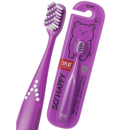 Зубная щетка SPLAT Junior c мягкой антибактериальной щетиной бережно очищает зубы и массирует десны. Ионы серебра в составе 3400 щетинок препятствуют размножению бактерий на ней. Особая форма позволяет лежать щетке на боку, не касаясь щетиной поверхности. Максимально продуманно и гигиенично! Щетка предназначена для детей от 5 лет.