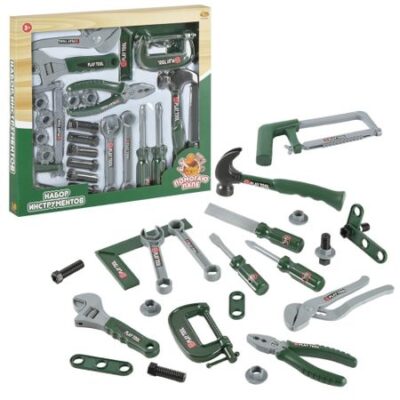 Инструменты в наборе «Помогаю папе», в коробкеИгровой набор инструментов из серии «Помогаю Папе» — необходимый элемент в игровой комнате каждого мальчика. Игрушки с ранних лет научат малыша первичным навыкам работы с инструментами. Все инструменты изготовлены из качественного пластика, поэтому абсолютно безопасны для игры. Мальчик сможет наблюдать за папой и повторять все его действия, но уже с помощью своего набора «Помогаю папе».Комплектация (24 предмета): струбцина, пассатижи, молоток с гвоздодером, напильник, крестообразная отвертка, шлицевая отвертка, торцевой ключ 2 шт., болт 6 шт., ножовка, разводной ключ, щипцы, лекало 6 шт., складная линейка.Дополнительно:Для детей от 3-х лет.Вес: 540 гр.Размер упаковки (д/ш/в): 33,5x36x3 см.Для работы батарейки не требуются.