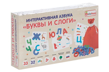 Интерактивная азбука Алатойс буквы и слоги 33буквы/32 карточки/мешочек