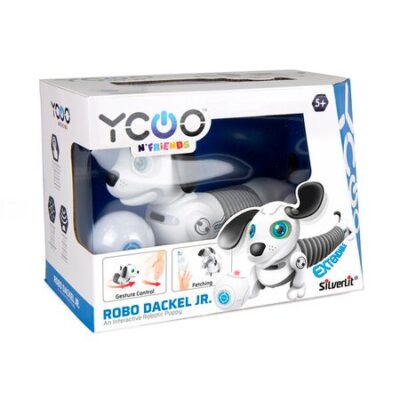 Основные характеристики: В наборе: собака-робот, мяч, пульт управления. Требуются батарейки: для робота — 3 х ААА; для пульта — 1 х ААA. Упаковка размером 3,7 х 30,3 х 22,8 см. Для детей от 5 лет. В вашем доме должна появиться интерактивная собака Дэкел бренда YCOO. Это робот, который оснащён интересными функциями и реалистичным поведением. Только представьте себе: он умеет следовать за мячом и за вами; реагировать на поглаживания; удлиняться на 70 %; играть с маленьким Дэкелом (вместе с ним бежать за мячом и может управляться с помощью его пульта). Но это еще не всё… Управлять роботом вы сможете даже с помощью жестов! Он распознает вашу руку и будет следовать за ней. Необходимо только приобрести батарейки: для робота — 3 х ААА; для пульта — 1 х ААA. С такой игрушкой ребёнок не только весело проведёт время, но и будет проявлять заботу о питомце, научится быть ответственным.