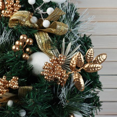 Искусственная елка настенная «Зимнее волшебство. Ветка ажурная», 50×27 см, ПВХ ветки отгибаются. Настенная елка «Ажурная», 50 см, с бело-золотым декором — это мягкий и доброжелательный акцент для новогоднего убранства. Подвесная модель высотой 50 см выполнена из ПВХ-веток с отгибающимся креплением, имеет зеленую хвою и украшения белого и золотистого цветов — элемент оформления в стиле скандинавского минимализма и датской простоты для тех, кто ценит свет, объем и атмосферу праздника в формате настенного или дверного декора. <b> Особенности</b> <ul> <li> Тип — подвесная елка, крепится на стену, дверь или окно без сложного монтажа.</li> <li> Материал — ПВХ, обеспечивает мягкость формы и прочность при ежегодном использовании.</li> <li> Форма — легко расправляющиеся ветки создают плотную и пышную крону сразу после установки.</li> <li> Декор — елочные игрушки бело-золотой гаммы усиливают зимнюю тематику и добавляют образу движения, света и тепла.</li> <li> Стиль — сочетание лаконичности скандинавского дизайна и строгости классики в одной целостной форме.</li> </ul> <b> Праздник начинается с одного взгляда на золотые шары и крону</b> Эта елка делает любое помещение частью вашей личной истории о чуде и подарках. Зеленые тона и теплый бело-золотой декор работают вместе, чтобы передать дух Нового года и предпраздничное ожидание. Используйте ее как самостоятельный элемент или как фон для других акцентов — одинаково ярко усиливает атмосферу торжества и доброжелательность дома.