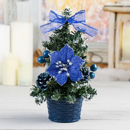 Искусственная елка настольная «Зимнее волшебство. Новогодний восторг», 20 см, со снегом, ветки ПВХ отгибаются. Настольная мини-елка с отгибающимися ПВХ ветками и снежным декором высотой 20 см украшена синими и белыми шарами. Ее дизайн сочетает ар-деко, классику и скандинавские мотивы, создавая праздничное настроение и подчеркивая стиль интерьера. <b> Особенности</b> <ul> <li> Отгибающиеся ПВХ ветки формируют естественный силуэт и обеспечивают удобство размещения.</li> <li> Ёлочные украшения в холодных тонах добавляют зимнюю свежесть и торжественность.</li> <li> Диаметр нижнего яруса 11 см гарантирует устойчивость и компактность.</li> <li> Сочетание стилей — от новогоднего барокко до шебби-шик — расширяет возможности декорирования.</li> <li> Материалы обеспечивают долговечность и простоту ухода.</li> </ul> <b> Создаем праздничное настроение</b> Эта мини-елка станет акцентом в домашнем или офисном пространстве, наполняя его атмосферой зимнего уюта и торжества.