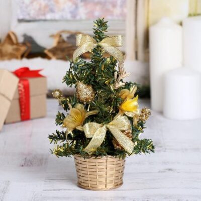 Искусственная елка настольная «Зимнее волшебство. Цветы», 20 см, золото, ПВХ ветки отгибаются. Настольная елка высотой 20 см с зеленой хвоей и золотистыми украшениями создает изысканный акцент для новогоднего интерьера. Гибкие ПВХ ветки можно отгибать, чтобы придать композиции естественный объем и индивидуальность. <b> Особенности</b> <ul> <li> Компактный размер подходит для размещения на столе, полке или подоконнике.</li> <li> Отгибающиеся ветки обеспечивают удобство в оформлении и позволяют корректировать форму.</li> <li> Золотистый декор подчеркивает праздничное настроение и гармонирует с разными стилями — от классики и ар-деко до фьюжн и новогоднего барокко.</li> <li> Материалы на основе ПВХ гарантируют долговечность и легкий уход.</li> </ul> <b> Создайте атмосферу праздника</b> Эта мини-елка привнесет в пространство тепло и торжественность, помогая наполнить дом или офис уютом и праздничным настроением.