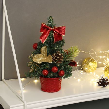 Искусственная елка настольная «Зимнее волшебство. Бантик» 21 см, ветки ПВХ отгибаются, игрушки красные шары и бант. Настольная елка «Бантик», 21 см, с красными шарами — это мягкий и доброжелательный элемент новогоднего декора. Искусственная елка высотой 21 см выполнена из ПВХ-веток с отгибающимся креплением, дополнена красным бантом и елочными игрушками в виде шаров — украшение в стиле новогоднего барокко и советской эстетики для дома или офиса. Решение для тех, кто ценит свет, уют и зимнюю атмосферу в мини-формате. <b> Особенности</b> <ul> <li> Тип — настольная елка, легко размещается даже на маленьком подоконнике или рабочем столе.</li> <li> Материал — ПВХ, обеспечивающий мягкость хвои и долгий срок службы при ежегодном использовании.</li> <li> Форма — ветки отгибаются, создавая пышную крону за считанные минуты после распаковки.</li> <li> Декор — красные шары и бант, усиливающие праздничную тематику и добавляющие образу движения и тепла.</li> <li> Стиль — сочетание традиций барокко и советского дизайна в одной логичной и целостной форме.</li> </ul> <b> Праздник начинается с одного бантика</b> Эта елка делает пространство готовым к встрече Нового года. Зеленая хвоя и яркие красные акценты работают вместе, передавая дух чуда и ожидания подарков. Используйте как самостоятельный элемент или как часть общей композиции — одинаково хорошо усиливает атмосферу торжества и семейного тепла.