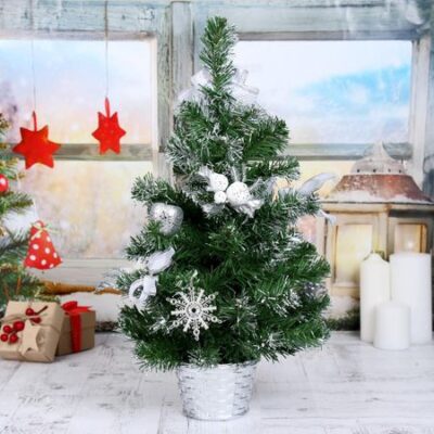 Искусственная елка настольная «Зимнее волшебство. Полосатые ленточки», 50 см, белый, ветки отгибаются. Настольная белая елка высотой 50 см с отгибающимися ветками и зеленой хвоей дополнена украшениями в виде полосатых лент. Диаметр нижнего яруса 27 см обеспечивает устойчивость и компактность, что делает ее удобной для декорирования различных поверхностей. Сочетание классических и скандинавских элементов с фьюжн-акцентами создает универсальный новогодний образ. <b> Особенности</b> <ul> <li> Отгибающиеся пластиковые ветки помогают придать естественную форму и объем.</li> <li> Белые украшения с полосатыми лентами добавляют нежности и праздничного настроения.</li> <li> Размеры подходят для размещения на столе, полке или подоконнике.</li> <li> Стиль сочетает классику, шебби-шик и советские мотивы, создавая разнообразие в декоре.</li> <li> Изготовлена из прочного пластика, обеспечивающего долговечность и легкость ухода.</li> </ul> <b> Праздничная атмосфера</b> Эта мини-елка помогает создать уют и подчеркивает праздничный дух в доме или офисе. Ее лаконичный дизайн и функциональность делают украшение удобным и привлекательным выбором для тех, кто ценит стиль и практичность в новогоднем декоре.