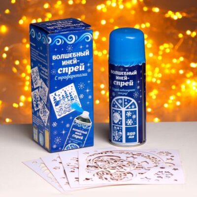 Искусственный снег спрей «С Новым годом!», с трафаретами, голубой. Новогодний спрей-иней поможет создать зимнюю сказку в вашем доме. С его помощью у вас получится создать эффект настоящего инея. Спрей придаст интерьеру праздничную свежесть и ощущение снежного утра. <b> Особенности</b> <ul> <li> Объем спрея — 250 мл.</li> <li> В комплекте есть 4 трафарета для нанесения спрея.</li> <li> Спрей создаст реалистичный снежный эффект на любых поверхностях.</li> <li> Искусственный снег подходит для использования в закрытых помещениях, потому что он не содержит вредных веществ.</li> </ul> Используйте искусственный снег для декорирования окон, елок и праздничных композиций. Добавьте праздничную атмосферу в свой дом! <b> Как удалить спрей</b> После праздников спрей легко смыть водой с мылом или мягким моющим средством.