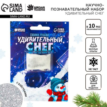Искусственный снег своими руками «Новый год!», 10 г, белый с блестками, набор для опытов. Подарите своему ребенку настоящую зимнюю сказку! Волшебный снег — это удивительный эксперимент, который заинтересует и ребенка и взрослого. Добавьте воды и вы увидите, как вещество увеличивается в объеме за несколько минут. Снег не тает, имеет рассыпчатую структуру, мягкий и приятный на ощупь. С помощью снега вы можете украсить комнату, где сбудутся самые заветные желания, или припорошить им красавицу-ель. Благодаря своей структуре снег идеально подходит для сенсорных занятий с малышами.