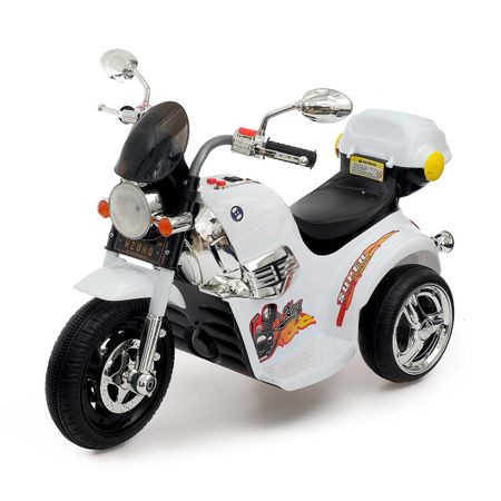 Электромобиль «Чоппер», с аккумулятором, световые и звуковые эффекты, цвет белый. Электромобиль «Чоппер» — это стильный трехколесный транспорт для активного малыша. Он заводится с помощью кнопочного переключателя, оснащен мощным электромотором и аккумулятором. Большие колеса с четким рисунком протектора шин дают хорошее сцепление с дорогой. На багажнике расположен открывающийся бардачок для хранения небольших предметов и игрушек. <b> Особенности модели:</b> <ul> <li> одно посадочное место;</li> <li> звуковые эффекты (гудок и 3 песни);</li> <li> светящаяся передняя фара;</li> <li> мигающий проблесковый маячок;</li> <li> большие пластиковые колеса;</li> <li> педаль газа для движения вперед;</li> <li> удобные ручки для держания;</li> <li> вместительный бокс для хранения игрушек;</li> <li> пластиковые колеса;</li> <li> задний ход;</li> <li> широкие подножки.</li> </ul> <b> Функциональные характеристики</b> <ul> <li> Аккумулятор: 6V4AH.</li> <li> Мотор: RS 380 6V.</li> <li> Размер в собранном виде: 90 × 43 × 54 см.</li> <li> Диаметр колес: 23 см.</li> <li> Допустимая весовая нагрузка: 30 кг.</li> <li> Максимальная скорость: 2‒3 км/ч.</li> <li> Беспрерывное время работы: 40‒60 минут.</li> <li> Время зарядки аккумулятора: 8‒12 часов.</li> </ul> В комплект входит зарядное устройство для аккумулятора.