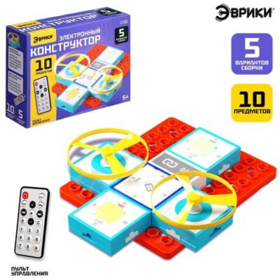 Электронный конструктор, 10 деталей, управление с пульта. Электронный конструктор «Эврики» поможет ребенку познакомиться с законами физики и электроники. Он легко собирается по инструкции, все электросхемы работают с помощью пульта управления. Пропеллеры вращаются в разные стороны, а лампы горят разными цветами, в зависимости от того, как их подключить. <b> Особенности</b> <ul> <li> Конструктор состоит из 10 деталей.</li> <li> В инструкции описано 5 вариантов сборки конструктора.</li> <li> Для зарядки конструктора в комплекте есть кабель TYPE-C.</li> <li> Набор подходит для детей от 5 лет.</li> </ul>
