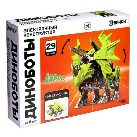 Электронный конструктор «Диноботы: Стиракозавр», 29 деталей. С электронным конструктором ребенок соберет могучего стиракозавра и освоит основы робототехники. Набор объединяет сразу три игрушки: конструктор, животное и робота. Конструктор понравится любителям собирать модели и оживлять их. Ведь динобот оснащен электродвигателем, а внушительный внешний вид древней рептилии никого не оставит равнодушным! <b> Особенности электронного конструктора</b> <ul> <li> Динобот собирается из 29 пластиковых деталей с помощью специальной отвертки, которая входит в комплект.</li> <li> На этапе сборки корпуса встраивается электромотор с редуктором — он отвечает за механизм движения.</li> <li> Размер в собранном виде: 32 × 18 × 18,5 см.</li> <li> Конструктор работает от 1 батарейки типа AAA, нет в комплекте.</li> <li> Робот включается переключателем на корпусе электромотора. После включения динобот «оживет» и пойдет.</li> </ul> <b> Учимся играя</b> Сборка модели поможет в развитии мелкой моторики, логики, мышления и воображения. В процессе увлекательной игры маленький исследователь познакомится с принципом работы электричества. <b> Серия конструкторов «Эврики. Робототехника»</b> В серию вошли наборы по созданию различных подвижных моделей роботов в виде техники, животных, транспорта, космических кораблей и т.д. Собранные модели работают не только от привычных элементов питания, но и от альтернативных источников: солнечных батарей и самодельных батарей (вода с солью) и пр. С такими наборами знакомиться с техникой будет просто и увлекательно!