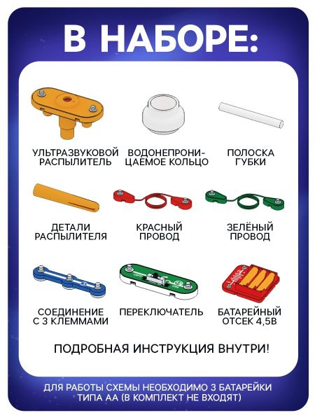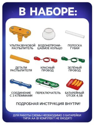 Электронный конструктор «Увлажнитель воздуха», ультразвуковой. С этим набором ребенок будет экспериментировать и создавать электрические устройства самостоятельно. Конструктор «Эврики» предназначен для сборки различных простых электронных схем. Соединение элементов между собой производится с помощью специальных кнопочных креплений — это удобно, легко и быстро. Собранные схемы не требуют настройки и работают сразу. Играя с таким конструктором, ребенок развивает логику, усидчивость и внимание, а также познает основы электроники. Конструктор работает от 3 батареек типа АА. Батарейки в комплект не входят.