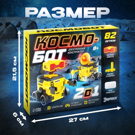 Электронный конструктор «Космобот», 2 в 1, радиоуправляемый, на батарейках, 82 детали. Соберите игрушку на радиоуправлении своими руками! Космобот — это конструктор 2 в 1. В собранном виде он легко может перевоплощаться в другую игрушку, нужно лишь поменять местами несколько деталей. Подробная инструкция по сборке есть в комплекте. <b> Особенности</b> <ul> <li> Управляйте Космоботом с помощью пульта радиоуправления.</li> <li> Конструктор состоит из 82 деталей.</li> <li> Для сборки потребуются плоскогубцы и пилка (в комплект не входят).</li> <li> Для работы Космобота понадобятся 5 батареек типа AAA (в комплект не входят).</li> <li> Игрушка подходит для детей от 8 лет.</li> </ul> «Эврики» — это качественные наборы для детей, которые развивают мелкую моторику, логическое мышление, усидчивость и расширяют кругозор ребенка!