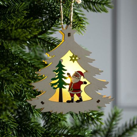 Ёлочная игрушка «Ёлочка с Дедом Морозом», от батареек, свечение теплое белое. Разнообразные новогодние световые фигуры — это прекрасный вариант оформления к Новому Году и любому другому торжеству, а также отличное дополнение интерьера. Сегодня такие фигуры довольно активно используются в качестве светового оформления различных кафе, торговых центров, магазинов и ночных клубов, равно как и для создания новогоднего оформления в доме, офисе, и даже на улице. Знакомые на первый взгляд фигурки снабжены одним или несколькими светодиодами, что превращает их из привычных в сказочные. Полные света и нежного сияния игрушки работают от батареек, поэтому не ограничивайте свою фантазию – вешайте их куда угодно, даже на самые высокие ветки, их отовсюду будет видно! Изделие станет эффектным дополнением к гирлянде или даже оригинальной заменой ей. Игрушка ярко светится, потребляет совсем мало энергии и не нагревается.
