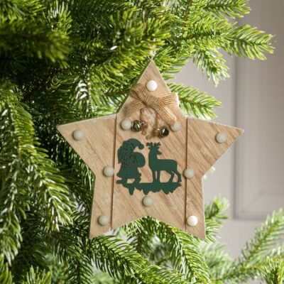 Ёлочная игрушка «Звезда с Дедом Морозом и оленем», от батареек, свечение теплое белое. Разнообразные новогодние световые фигуры — это прекрасный вариант оформления к Новому Году и любому другому торжеству, а также отличное дополнение интерьера. Сегодня такие фигуры довольно активно используются в качестве светового оформления различных кафе, торговых центров, магазинов и ночных клубов, равно как и для создания новогоднего оформления в доме, офисе, и даже на улице. Знакомые на первый взгляд фигурки снабжены одним или несколькими светодиодами, что превращает их из привычных в сказочные. Полные света и нежного сияния игрушки работают от батареек, поэтому не ограничивайте свою фантазию – вешайте их куда угодно, даже на самые высокие ветки, их отовсюду будет видно! Изделие станет эффектным дополнением к гирлянде или даже оригинальной заменой ей. Игрушка ярко светится, потребляет совсем мало энергии и не нагревается.