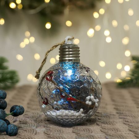 Ёлочная игрушка «Пора чудес. Веточки», светящаяся, пластиковая, d=8 см, прозрачный. Светящаяся елочная игрушка «Шар с веточками» прозрачная с коричневыми деталями — это добрая и атмосферная деталь для новогоднего декора. Пластиковый шар с имитацией зимних веток внутри создает эффект светящейся сказки — украшение в духе скандинавского и датского стиля для тех, кто ценит свет, форму и ощущение праздника в лаконичной и понятной подаче. <b> Особенности</b> <ul> <li> Тип — светящаяся елочная игрушка, используется как самостоятельный акцент или в составе общей композиции при оформлении елки и интерьера.</li> <li> Материал — прочный пластик, обеспечивающий безопасность и долговечность при ежегодном использовании в предпраздничные дни.</li> <li> Подсветка — встроенная, работает от батареек, дает мягкое мерцающее освещение, усиливающее ощущение чуда и уюта без лишней детализации.</li> <li> Форма — шар, дополненный прозрачностью и внутренним наполнением в виде веточек, создающий объемный и живой образ зимы.</li> <li> Цвет — прозрачное основание с коричневыми элементами, добавляет оформлению натуральности, свежести и тепла в холодной, но доброжелательной палитре.</li> </ul> <b> Праздник начинается с первого мерцания внутри шара</b> Эта игрушка делает елку частью вашей истории о подарках, чуде и тихом зимнем волшебстве. Прозрачный корпус, веточки и мягкий свет работают вместе, чтобы передать дух Нового года и семейное тепло. Используйте ее как центральный акцент или рядом с другими украшениями — одинаково эмоционально усиливает атмосферу торжества и добрую предпраздничную гармонию.