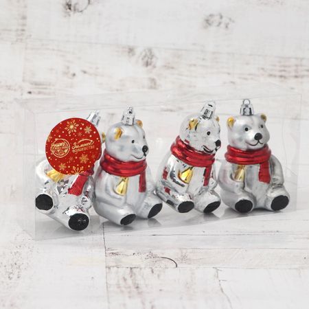 Ёлочная игрушка 4 шт. «Мишка в шарфике» 5.5×8 см, серебро. Ёлочная игрушка в виде мишки в шарфике — это теплый и душевный акцент для новогодней елки. Набор из 4 серебристых фигурок (8 см в высоту) с рисунком добавляет декору нотку уюта, не нарушая праздничной строгости. Эти игрушки подойдут как для семейного украшения, так и как милый подарок к зимним праздникам. <b> Стиль и форма</b> <ul> <li> Игрушки выполнены в скандинавском и советском стиле — сочетание минимализма и тепла, отсылающее к детским воспоминаниям о Новом годе.</li> <li> Форма медведя — символ добродушия, покоя и домашнего уюта, особенно выразительно звучащий в атмосфере зимнего праздника.</li> <li> Рисунок на поверхности делает каждую игрушку живой: глаза, полосы на шарфике и контур лап — все это усиливает эмоциональную связь с образом.</li> <li> Серебристый цвет придает изделиям зимнюю свежесть и делает их универсальными в сочетании с другими оттенками.</li> </ul> <b> Декор с характером</b> Эти игрушки создают атмосферу домашнего праздника без пафоса и лишней яркости. Мишки в шарфиках — не просто украшения, а хранители теплых новогодних чувств. Они органично смотрятся среди шаров, бумажных подвесок или текстильных аксессуаров. Изготовлены из прочного пластика — прослужат несколько сезонов, сохранив цвет и форму. Идеальный выбор для тех, кто украшает елку с любовью и помнит, что главное в празднике — тепло внутри.