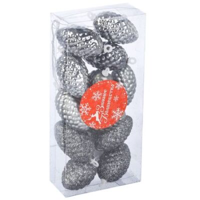 Ёлочные игрушки 12 шт. «Шишки» 4×2.5 см, серебро. Свет зимнего праздника на кончиках ветвей. Новогодние игрушки «Шишки» — это 12 серебристых украшений, выполненных из прочного пластика. Игрушки в форме шишек добавляют елке строгость и сияние, подходя для оформления в скандинавском, датском или ар-деко стиле. Дизайн сочетает минимализм советской эстетики и современную лаконичность, создавая ощущение спокойного торжества. <ul> <li> <strong> Двенадцать игрушек — основа для стильной композиции:</strong> Такое количество позволяет равномерно распределить акценты по всей елке, не перегружая ее.</li> <li> <strong> Форма шишки — отсылка к природе и традиции:</strong> Это не просто форма — она символизирует зиму, хвойный лес и классическое новогоднее оформление.</li> <li> <strong> Серебристый цвет — холодное сияние праздника:</strong> Оттенок напоминает морозный узор на стекле и мягкий свет рождественских огней.</li> <li> <strong> Однотонность — выдержанный стиль без лишних деталей:</strong> Украшения не требуют дополнительных акцентов — они завершают образ сами по себе.</li> <li> <strong> Пластик — долговечный и практичный материал:</strong> Не теряет блеск, не боится повреждений, легко чистится и подходит для многолетнего использования.</li> </ul> <strong> Ёлка с характером:</strong> Эти игрушки говорят о вкусе и понимании стиля. Они подходят тем, кто ценит лаконичность, но не отказывает себе в праздничном настроении. «Шишки» — не просто украшения, а элементы дизайна, создающие атмосферу зимнего спокойствия и радости.