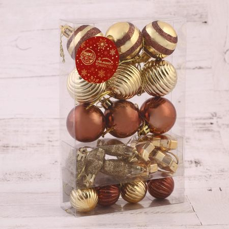 Ёлочные игрушки «Серпантин» , шары новогодние, набор 21 шт., кофейный/золотой. Новогодние шары «Серпантин» — это стильный и уютный набор для украшения елки в кофейно-золотой палитре. В комплекте 21 пластиковая игрушка разных оттенков с однотонными и декорированными элементами, выполненная в датском стиле. Такие украшения подчеркивают атмосферу зимнего праздника и добавляют интерьеру теплого света и домашнего уюта. <b> Особенности</b> <ul> <li> Форма — шар, универсальный элемент новогоднего дизайна.</li> <li> Цветовая гамма — сочетание золотистого и коричневого, создающее ощущение тепла и торжественности.</li> <li> Рисунок — часть игрушек с декоративными деталями, другие — с однотонной поверхностью.</li> <li> Стиль — датский дизайн, основанный на балансе цвета, текстуры и простоты форм.</li> <li> Комплектация — 21 штука, достаточно для создания яркого акцента или целостной композиции на дереве.</li> <li> Материал — прочный пластик, подходящий для многократного использования.</li> </ul> <b> Праздник начинается с тепла дома</b> Эти шары создают образ Нового года, где каждый элемент работает на уют и спокойствие. Кофейные и золотистые оттенки напоминают горячий напиток в холодный вечер — мягкие, но заметные в интерьере. Используйте их как основу декора или дополнение к уже имеющимся игрушкам — они одинаково хорошо вписываются в разные идеи оформления елки и праздничного пространства.