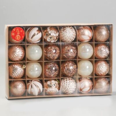 Ёлочные игрушки «Мелодия» ассорти люкс, шары новогодние, d=6 см, набор 24 шт., бело-золотой. Новогодние шары «Мелодия» — это праздничный декор, сочетающий классику и современный стиль. Набор из 24 пластиковых игрушек диаметром 6 см оформлен в бело-золотой палитре с элементами прозрачности, рисунком и наполнением. Идеально подходит для создания елки в духе ар-деко, датского дизайна или в стиле строгой классики. <b> Особенности</b> <ul> <li> Форма — шар, универсальный элемент новогоднего декора.</li> <li> Диаметр — 6 см, заметный, но не громоздкий размер для равномерного украшения елки.</li> <li> Цветовая гамма — бело-золотая, создающая ощущение торжества и зимней сказки.</li> <li> Стиль — сочетание классики, датского уюта и эстетики ар-деко.</li> <li> Комплектация — 24 штуки, достаточно для полного украшения дерева или акцентной композиции.</li> <li> Материал — прочный пластик, подходящий для многократного использования.</li> <li> Дополнительные элементы — часть игрушек с наполнением, другие — с рисунком или полностью прозрачные.</li> </ul> <b> Ёлка как отражение вкуса</b> Эти шары создают образ праздника, где каждый элемент работает на общий стиль. Бело-золотые оттенки добавляют блеска и тепла, а сочетание однотонных, прозрачных и украшенных деталей придает декору глубину. Это не просто украшения — это завершенная история праздника, которую легко разместить на елке и беречь год за годом.
