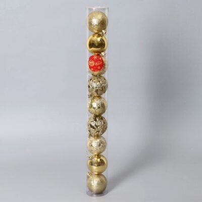 Ёлочные игрушки «Ёлочка в кружевах», шары новогодние, пластик, набор d=6 см, 9 шт., золотистый. Пластиковые новогодние шары золотистого цвета с резным узором — это элегантное решение для праздничного украшения елки. Игрушки диаметром 6 см выполнены в классической форме и декорированы орнаментом, что добавляет композиции зимней сказочности и изысканности. Набор из 9 элементов подходит для создания цельного образа или как акцент в уже сложившемся стиле ар-деко, барокко или строгой классики. <b> Почему выбирают этот набор</b> <ul> <li> <strong> Резной дизайн — детали с характером:</strong> Узор на поверхности каждого шара делает игрушку особенной и притягательной.</li> <li> <strong> Золото как мягкий свет:</strong> Цвет не кричит о себе, но отражает гирлянды, наполняя дом зимним сиянием.</li> <li> <strong> Девять игрушек — достаточно для гармонии:</strong> Комплект позволяет равномерно заполнить елку без докупки дополнительных украшений.</li> <li> <strong> Прочный пластик — надежность и долговечность:</strong> Украшения можно использовать год за годом, сохраняя их внешний вид.</li> </ul> <b> Сказка в каждом узоре</b> Эти шары созданы не просто для красоты, а чтобы стать частью новогоднего настроения. Резные узоры напоминают о морозных узорах на окне, а золотистый цвет добавляет празднику тепла. Подходят как для первого украшения, так и для обновления любимой традиции — без лишней пышности, но с ясным смыслом в каждом элементе.