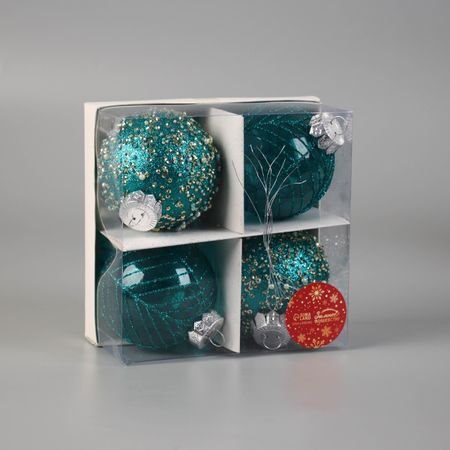 Ёлочные игрушки «Аустен», шары новогодние, d=8 см, 4 шт., паутинка, бирюзовый. Новогодние шары «Аустен» — это крупные игрушки для тех, кто украшает елку с вниманием к стилю и настроению. Бирюзовый цвет и рисунок в виде паутинки добавляют оформлению воздушности и утонченности, а 4 пластиковых украшения диаметром 8 см становятся заметными акцентами без излишней пышности. Набор подходит как для советского ретро-стиля, так и для современного шебби-шик. <b> Что делает их особенными</b> <ul> <li> Рисунок с паутинкой придает каждому шару индивидуальности и напоминает зимние морозные узоры.</li> <li> Бирюзовый оттенок создает мягкий контраст с классическими новогодними тонами, добавляя интерьеру свежести.</li> <li> Диаметр 8 см делает игрушки заметными даже на самой украшенной елке.</li> </ul> <b> Как использовать в оформлении</b> Эти шары созданы для тех, кто любит праздничный минимализм с характером. Их можно разместить симметрично по краям кроны или асимметрично — чтобы создать эффект «парящих» акцентов. Рисунок добавляет декору текстуры и напоминает о традиционных новогодних мотивах, но с современной интерпретацией.