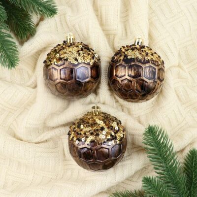 Ёлочные игрушки «Сказочные узоры» снежинки, шары новогодние, d=8 см, набор 3 шт., золотисто-коричневый. Набор елочных шаров с узором в виде снежинок сочетает в себе черты ар-деко, новогоднего барокко и скандинавского дизайна. Три украшения с диаметром 8 см в золотисто-коричневой гамме добавят теплоты и изящества в оформление праздничной елки. <b> Особенности</b> <ul> <li> В комплект входят три пластиковых шара с детализированным рисунком снежинок.</li> <li> Оптимальный диаметр 8 см подходит для разнообразных елочных композиций.</li> <li> Стиль объединяет геометрическую строгость, барочную роскошь и лаконичность датского дизайна.</li> <li> Цвета золотистого и коричневого создают эффект натурального сияния и уюта.</li> <li> Материал обеспечивает легкость и долговечность изделий для многолетнего использования.</li> </ul> <b> Изысканный акцент в декоре</b> Эти шары вносят в новогоднюю атмосферу особое настроение — сочетание благородства и сдержанности. Они гармонично впишутся в любой интерьер, подчеркнут внимательность к деталям и создадут уютный образ праздника.